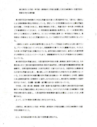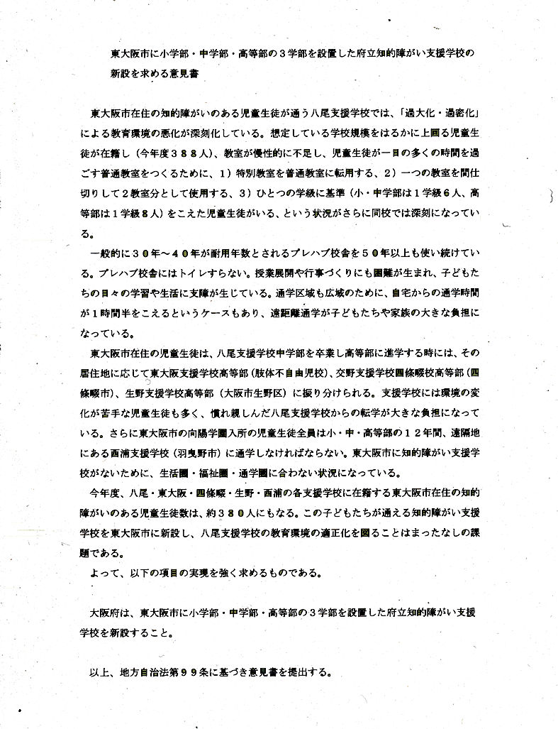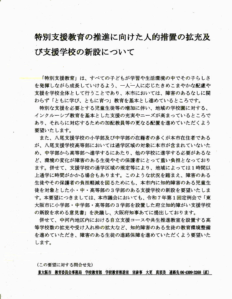 ※東大阪市に小・中・高一貫の知的障がい支援学校の新設を求める