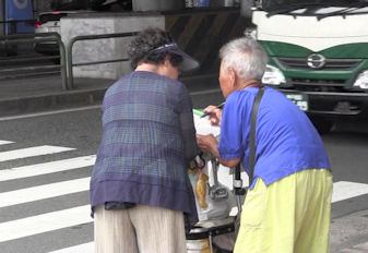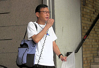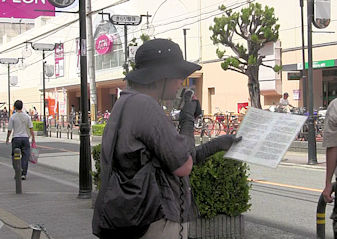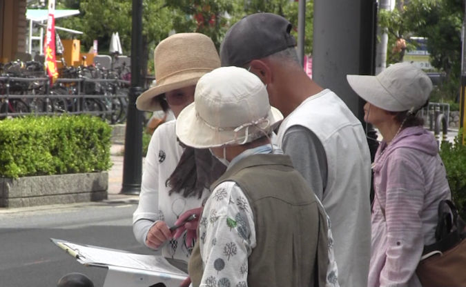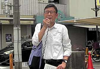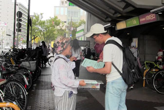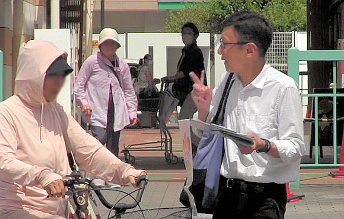 街頭で署名を訴える杉本琢哉さん(布施駅前) |
